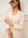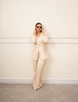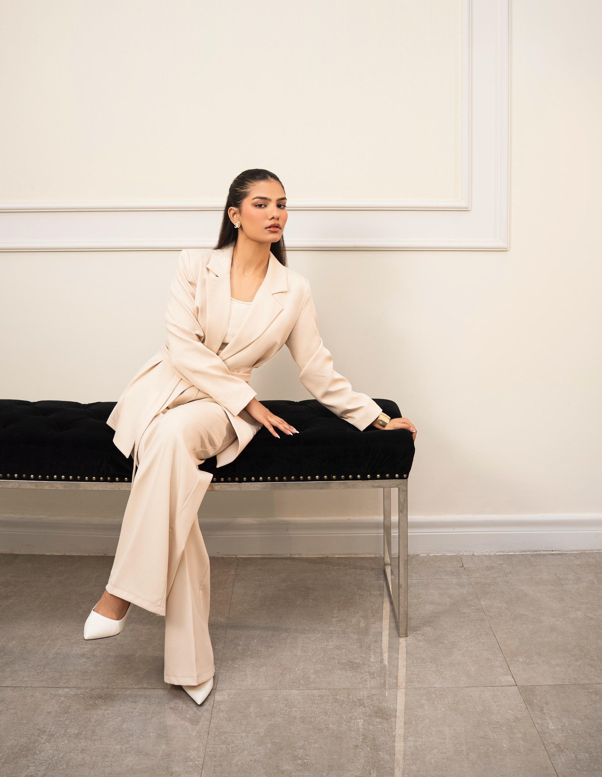 Effortless elegance meets modern tailoring in this beige belted suit set. Featuring a structured blazer with a waist tie and wide-leg trousers, this look balances power dressing with understated sophistication.
