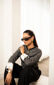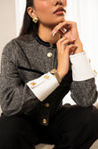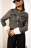 Make a statement with this tailored herringbone jacket featuring gold embossed buttons, contrast white cuffs, and flap pocket details. Its structured silhouette and luxe accents bring a touch of sophistication, perfect for elevating both casual and formal looks.