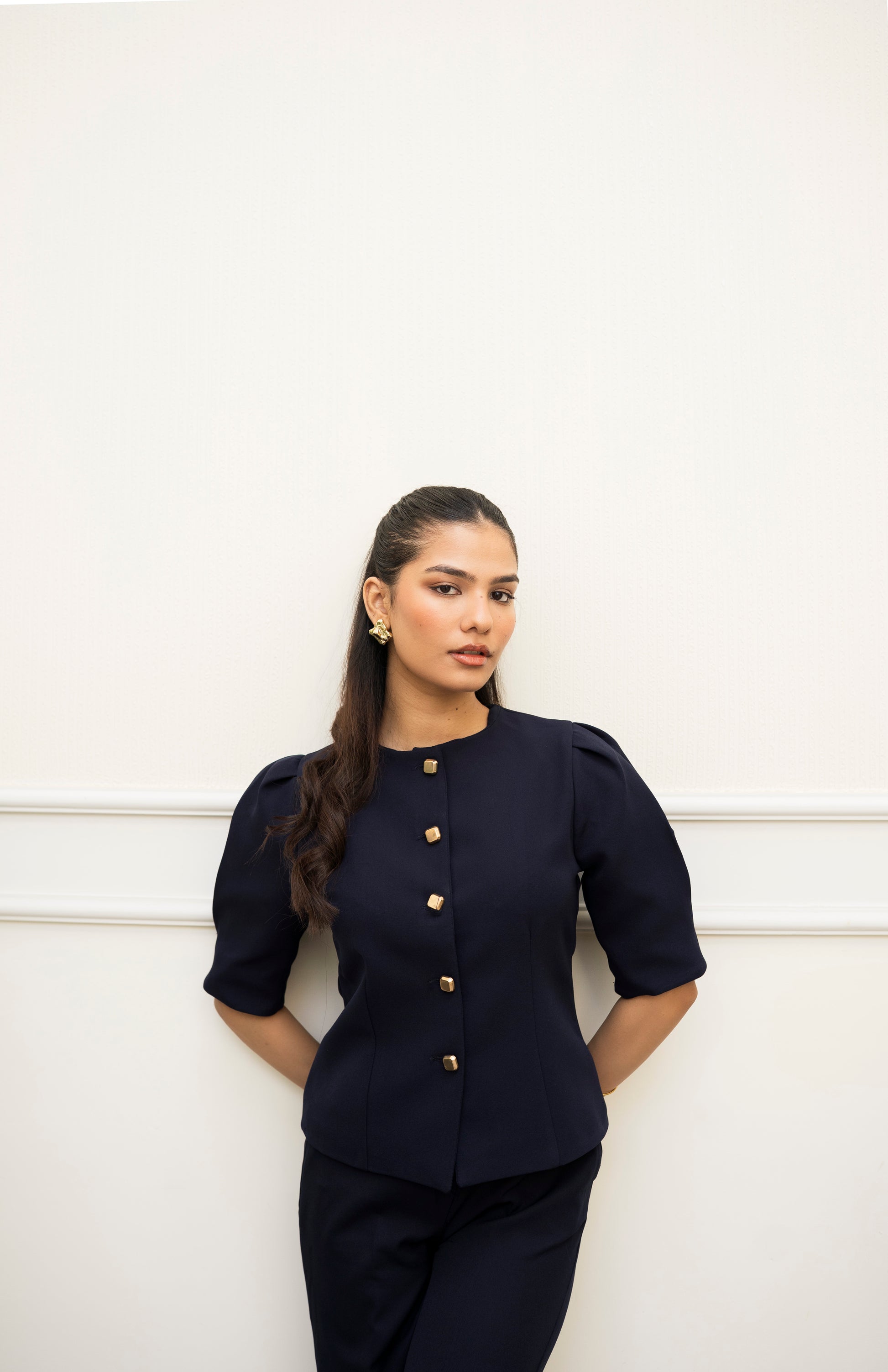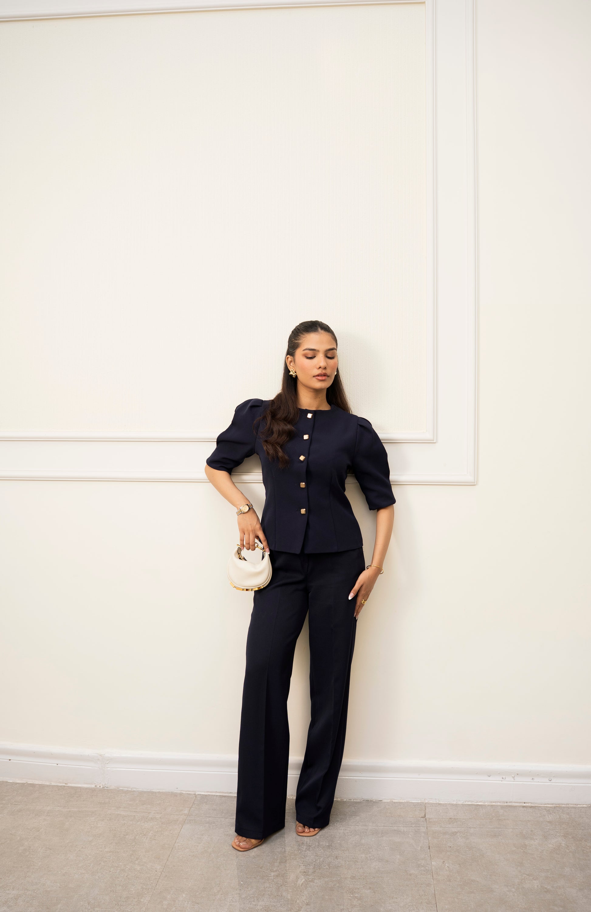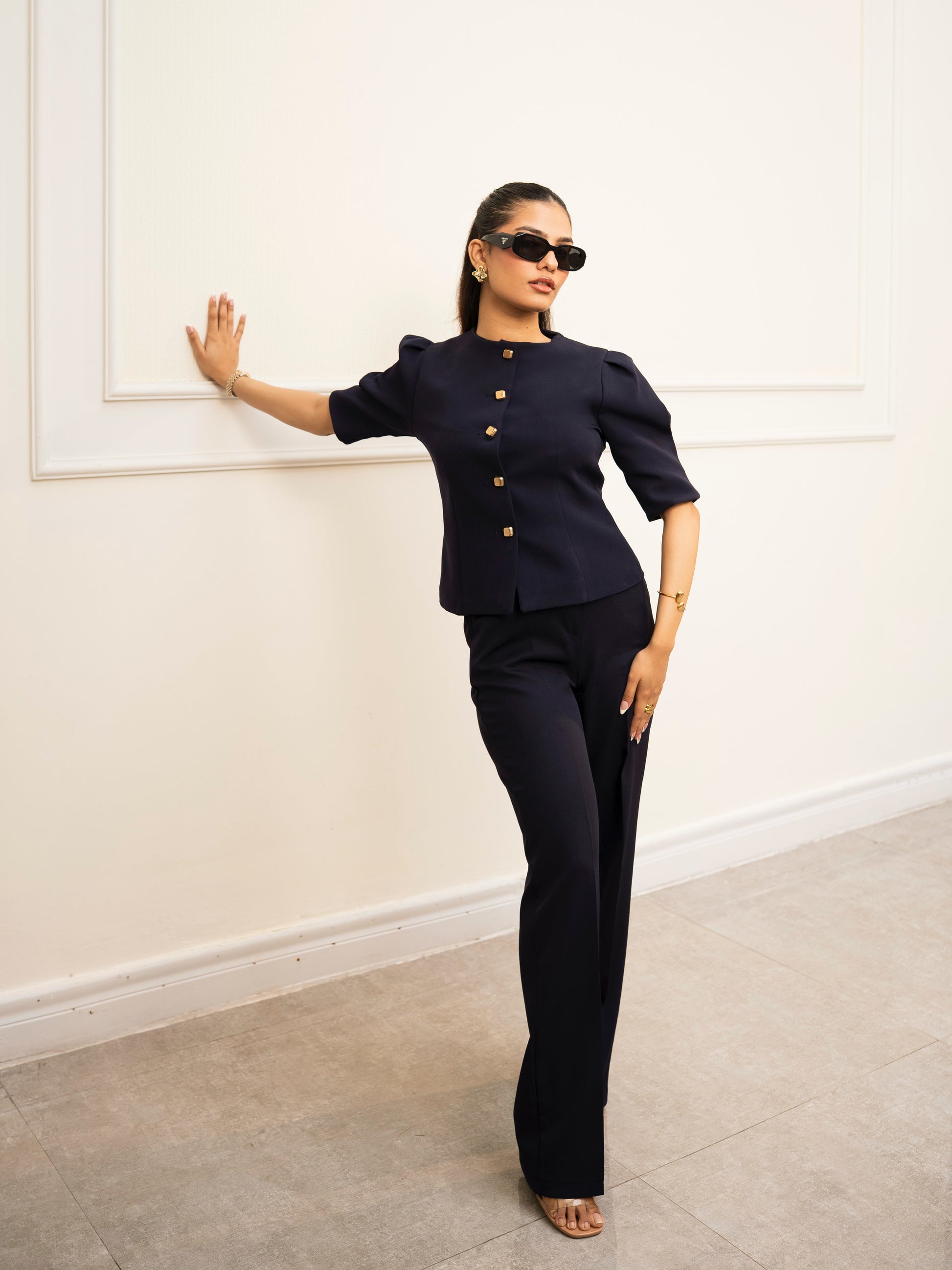 Elevate your style with this chic navy co-ord set featuring a structured button-down top with puffed shoulders and tailored straight-fit trousers