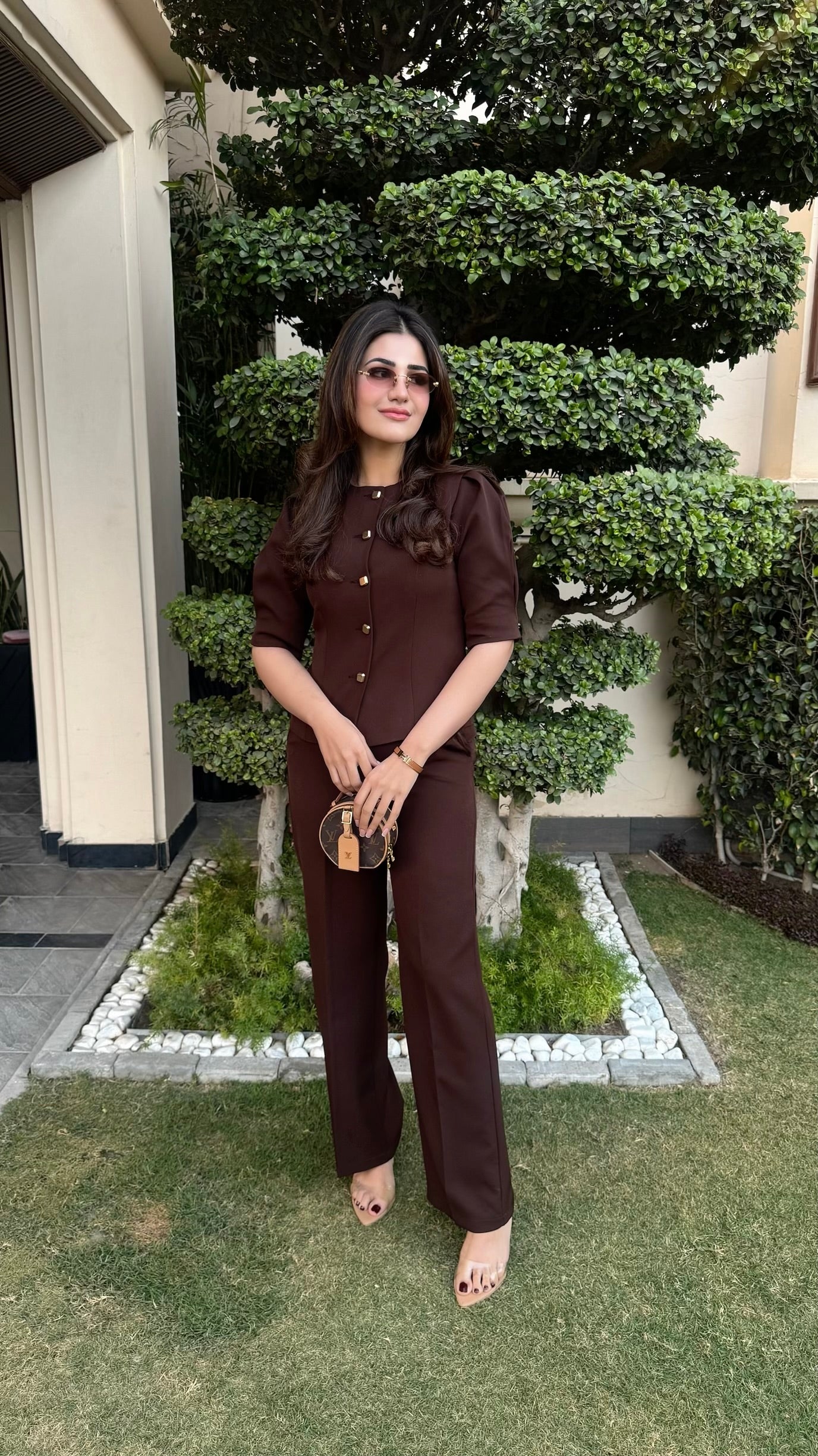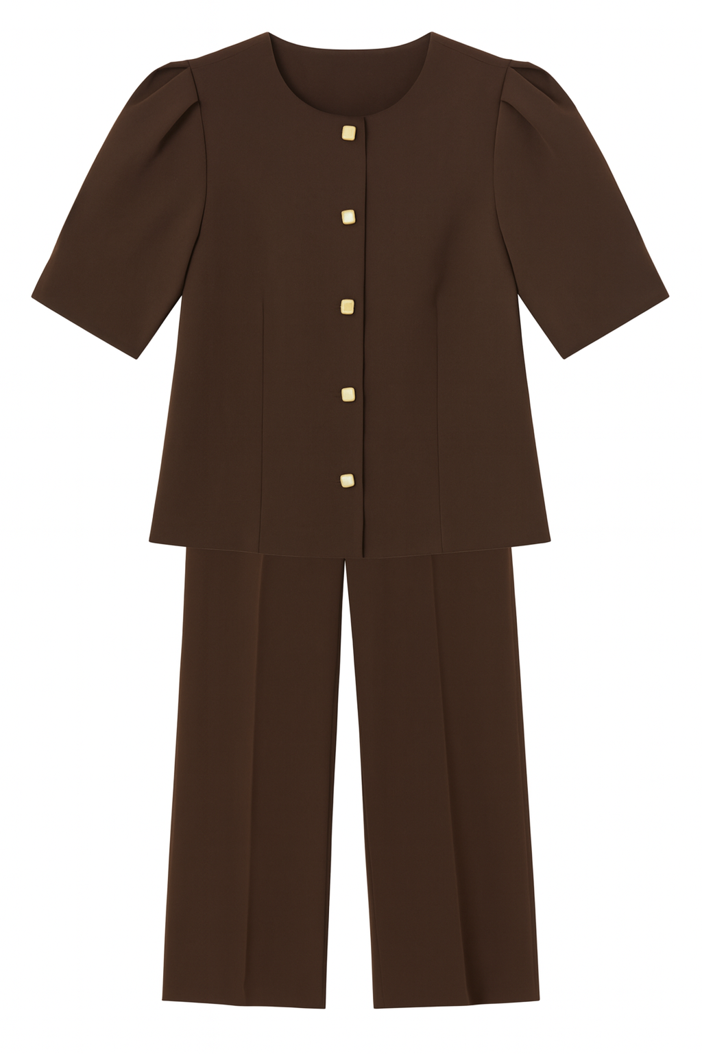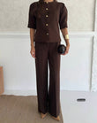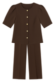 Elevate your style with this chic Mocha co-ord set featuring a structured button-down top with puffed shoulders and tailored straight-fit trousers