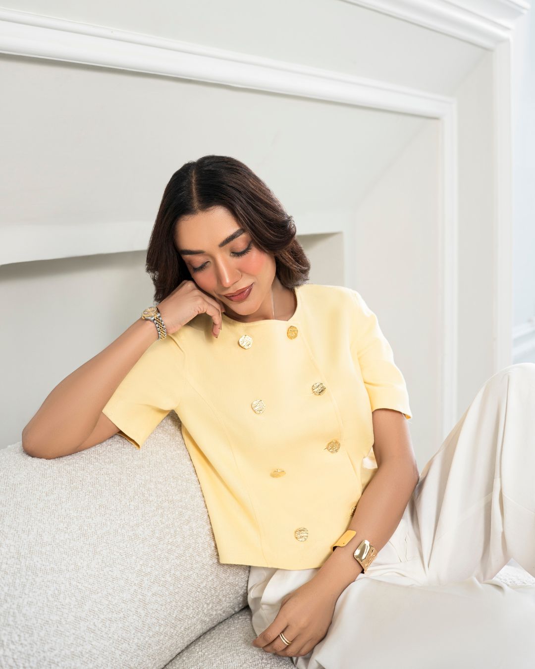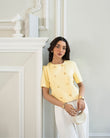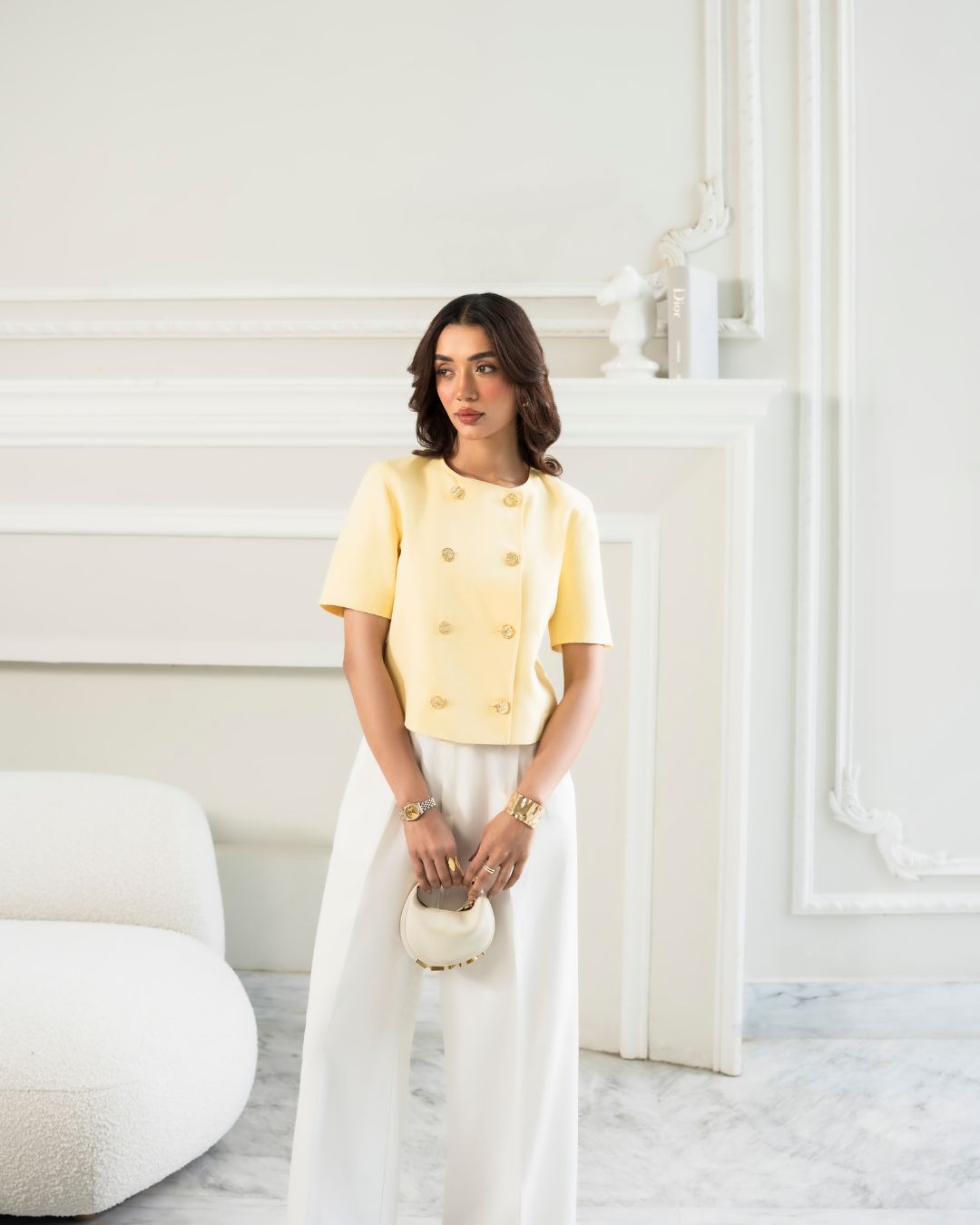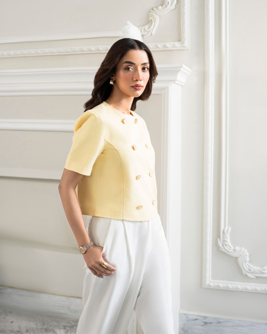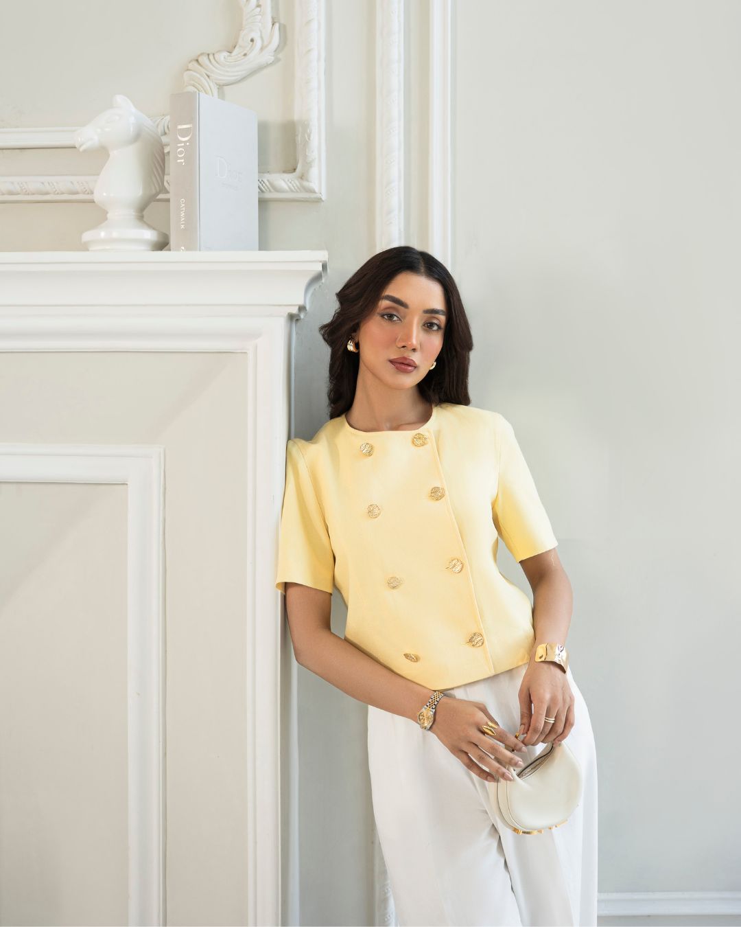 Brighten your wardrobe with this elegant pastel yellow vest, tailored in a structured silhouette that blends modern chic with timeless charm. Designed with short sleeves and a polished double-breasted front, it features statement gold-tone textured buttons that add a touch of sophistication. The clean lines and refined fit make it perfect for layering over trousers or skirts, effortlessly elevating both daytime and evening looks.
