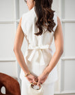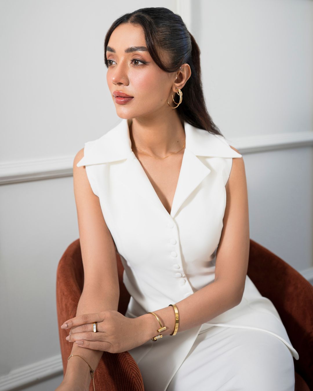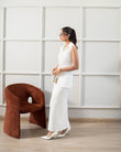 Elevate your wardrobe with this sleeveless tailored blazer, designed in a crisp white hue for a timeless and versatile look. Featuring a sharp V-neckline, structured shoulders, and a clean button-down front, this blazer blends sophistication with modern minimalism. The sleek silhouette and flap pockets add a refined touch, making it perfect for both professional and evening settings. Pair it with matching separates or style it over trousers for a chic statement.